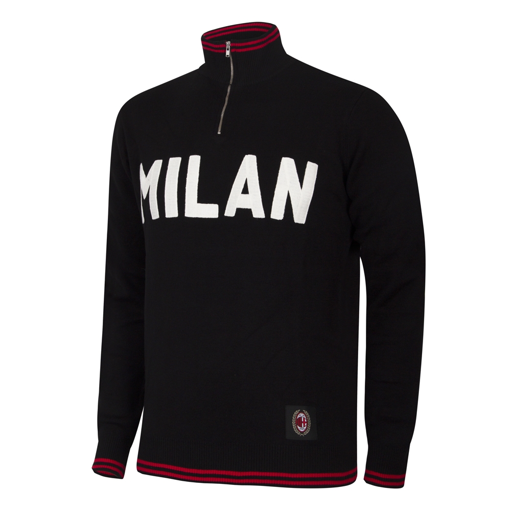 AC Milan Half-Zip-Pullover von COPA Football für Erwachsene. Der AC Milan Embroidery Pullover verfügt über einen Reißverschluss bis zur Brust und ist von den Trainingspullovern des AC Milan aus den 1960er-Jahren inspiriert. Der AC Milan Pullover ist überwiegend schwarz und weist rote und weiße Akzente auf. Die rote Farbe findet sich in den Streifen am Kragen, den Paspeln und am Saum der Jacke wieder. Mittig auf der Brust befindet sich eine Stickerei mit dem Namen des italienischen Fußballvereins, MILAN. Wunderschöner AC Milan Pullover mit Reißverschluss für den echten Milan-Fan! Der AC Milan Retro-Pullover von COPA Football hat eine normale Passform. Material: 55 % Acryl – 45 % Baumwolle.