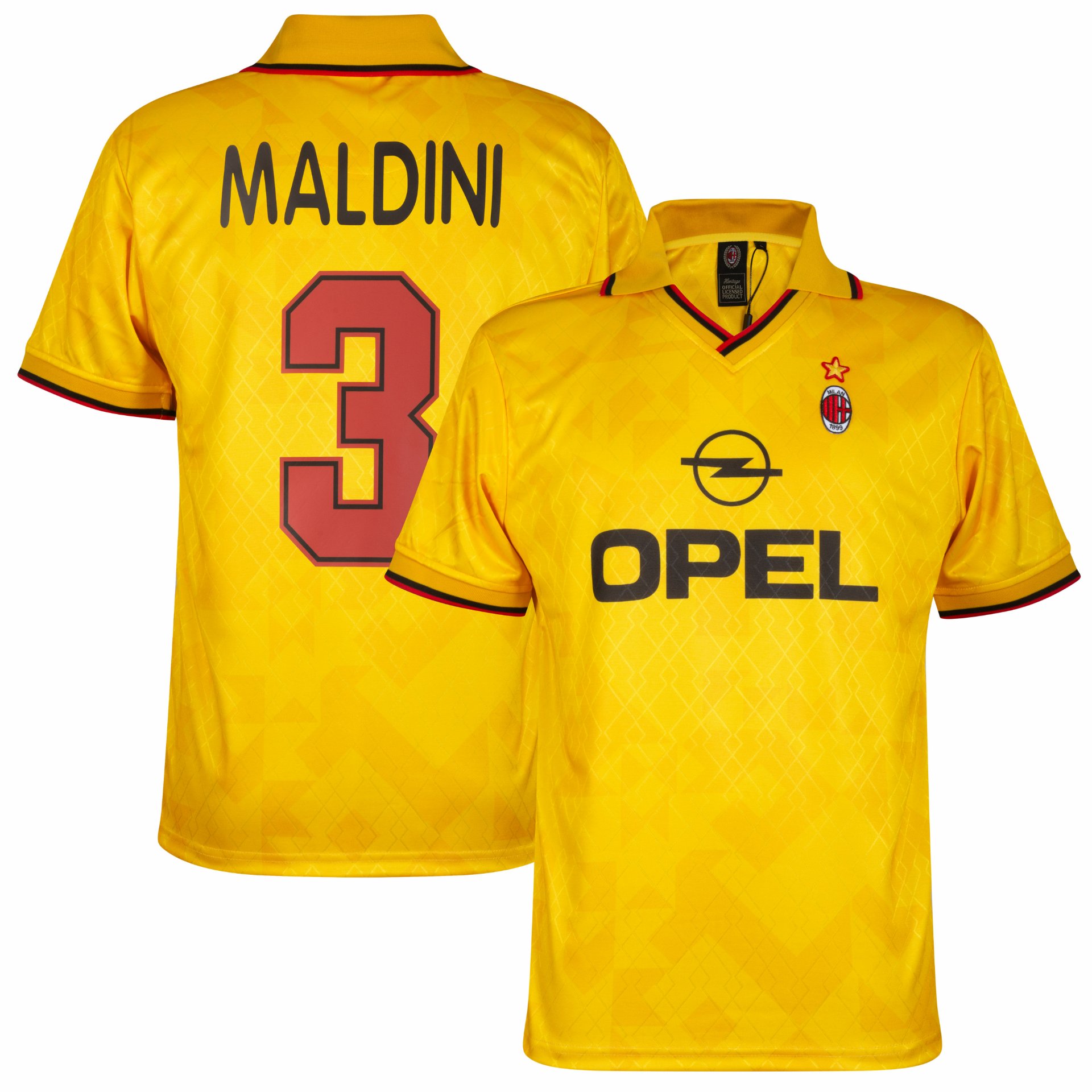 Dies ist das offizielle Ausweichtrikot des AC Mailand aus der Saison 1995/96. Auf dem Rücken prangt der Aufdruck „Maldini“ (3). Dieses Retro-Trikot basiert auf dem Ausweichtrikot des AC Mailand aus der Saison 1995/96. Es ist überwiegend gelb. Der Name des damaligen Sponsors Opel ist mittig aufgedruckt. Auf der linken Brust befindet sich das AC-Mailand-Logo mit einem goldenen Stern darüber. Das Trikot hat einen V-Ausschnitt und einen Polokragen mit rot-schwarzer Zierlinie. Auch die Paspelierung ist in diesen Farben gehalten. Ein fantastisches AC-Mailand-Trikot für jeden echten Milan-Fan! Das AC-Mailand-Retro-Trikot von COPA Football hat eine normale Passform. Material: 100 % recyceltes Polyester.