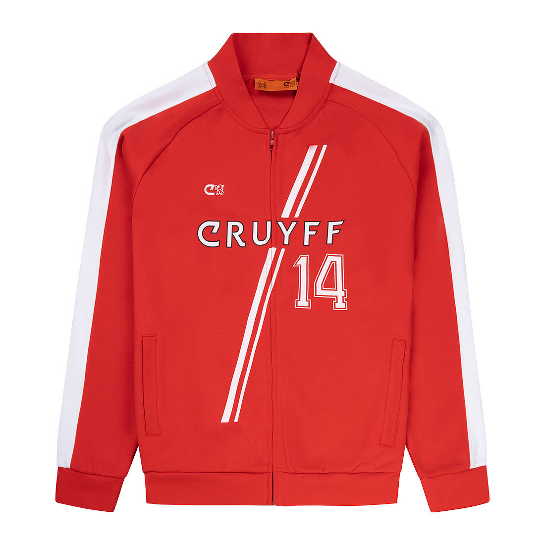 Le design associe une base rouge à des accents blancs. Le col baseball et les bandes blanches le long des deux manches confèrent à la veste un style sportif et authentiquement rétro. Le logo reconnaissable Cruyff est placé sur la poitrine droite, tandis que le nom CRUYFF est affiché au centre. Les deux bandes blanches diagonales apportent un design distinctif.