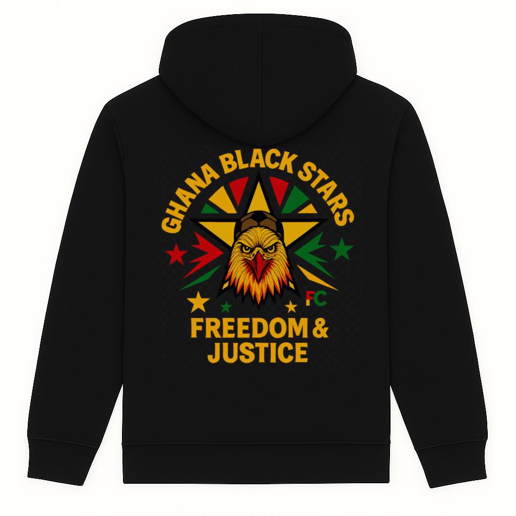 Sportlicher Ghana-Fußball-Hoodie von FC ELEVEN für Erwachsene. Der schwere Hoodie besteht aus dicker Bio-Baumwolle. Das auffälligste Merkmal des Hoodies ist der farbenfrohe Grafikdruck der Ghana Black Stars auf der Rückseite. Der Druck zeigt den Schriftzug „Ghana Black Stars“ und „Freedom & Justice“ mit einem Stern und einem Adler in der Mitte. Auf der linken Brust befindet sich zudem das Logo der Marke FC ELEVEN. Der schwere Hoodie ist komplett schwarz und verfügt über eine Kapuze mit Kordelzug sowie eine Kängurutasche. Die Passform ist normal. Material: 65 % Baumwolle und 35 % Polyester.