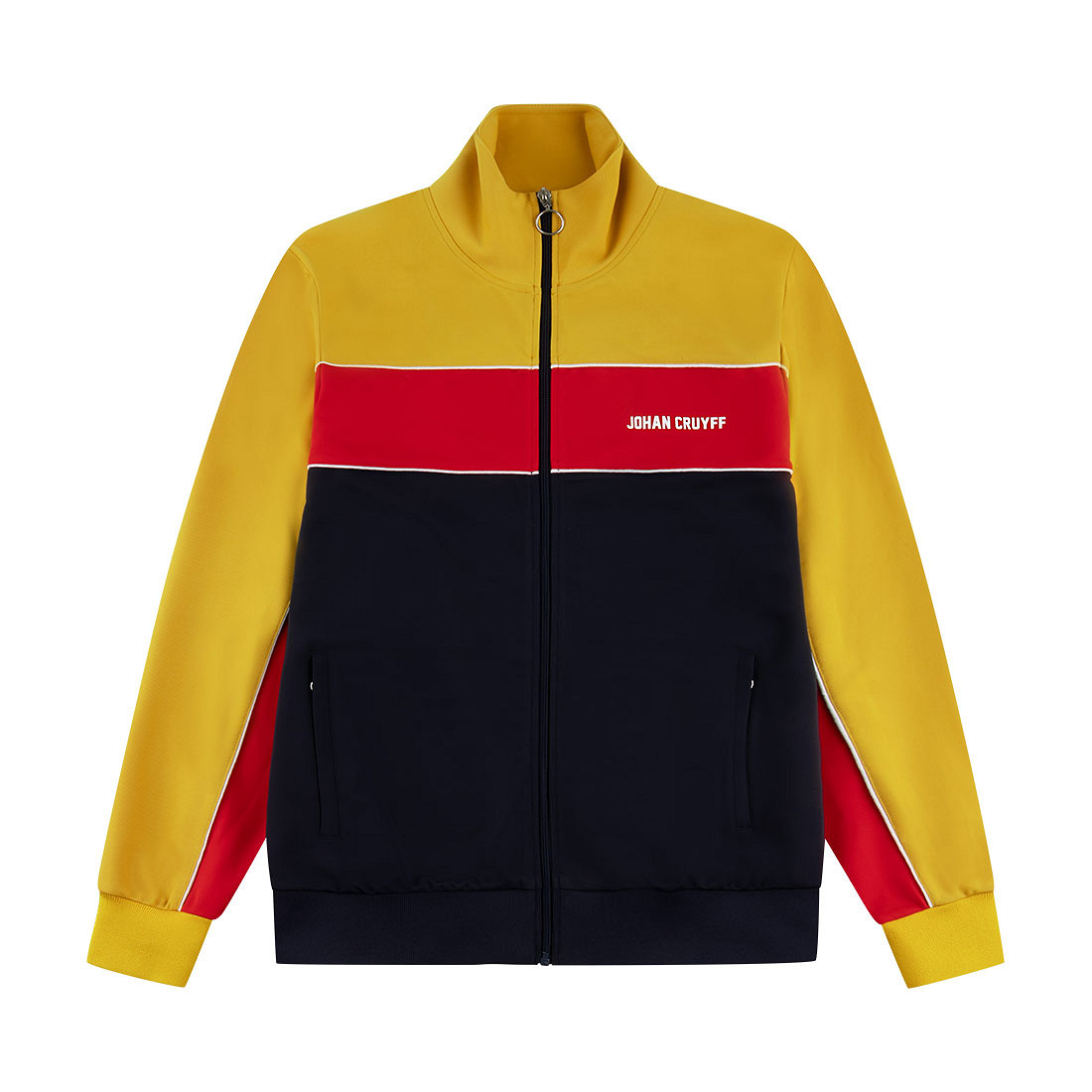 Veste d’entraînement rétro Johan Cruyff élégante en bleu marine avec des détails rouges et jaunes. Cette veste premium offre une coupe décontractée et un confort optimal. Elle est dotée de liserés blancs, d’un imprimé Johan Cruyff sur la poitrine gauche et de poches latérales zippées pratiques.