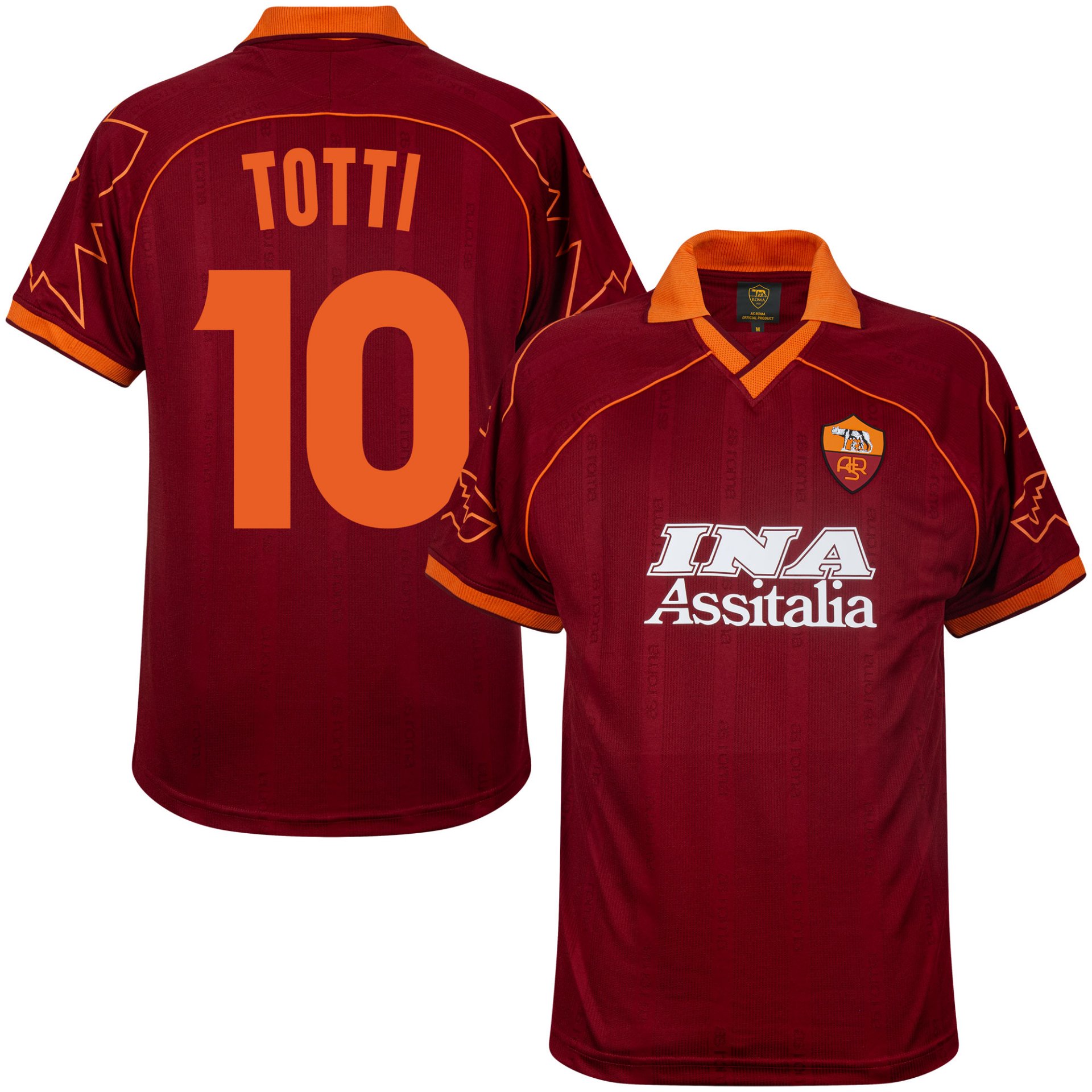 Maillot de football rétro AS Roma 1999–2000 de COPA Football, issu de la collection officielle de l’AS Roma. Le dos est orné du flocage de la légende de l’AS Roma, TOTTI (10). Ce maillot rétro de l’AS Roma est basé sur le maillot domicile porté par l’AS Roma lors de la saison 1999/00. Ce maillot de football rétro AS Roma possède des manches courtes et arbore la couleur rouge foncé traditionnelle. Il se distingue par le loup romain orange présent sur les deux manches. Le col polo et les liserés sont de couleur orange. Le nom de l’ancien sponsor, INA Assitalia, figure au centre de la poitrine. Sur la poitrine gauche se trouve le logo du club de football de Rome avec le célèbre loup romain. Ce maillot de l’AS Roma a été porté par des joueurs tels que Montella, Totti, Delvecchio, Cafu, Aldair, Nakata et d’autres stars.