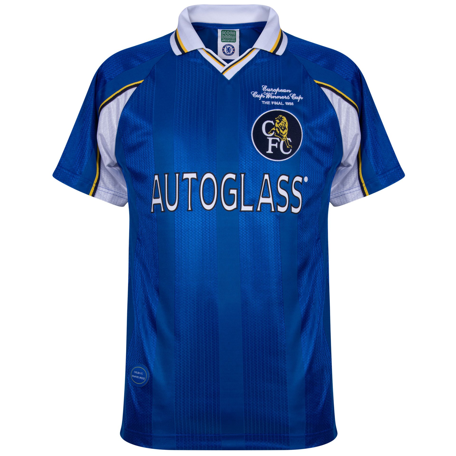 Couleur bleue traditionnelle avec détails blancs et jaunes. Col polo blanc avec finitions contrastées. Sponsor historique AUTOGLASS sur la poitrine. Écusson avec mention European Cup Winners Cup The Final 1998.