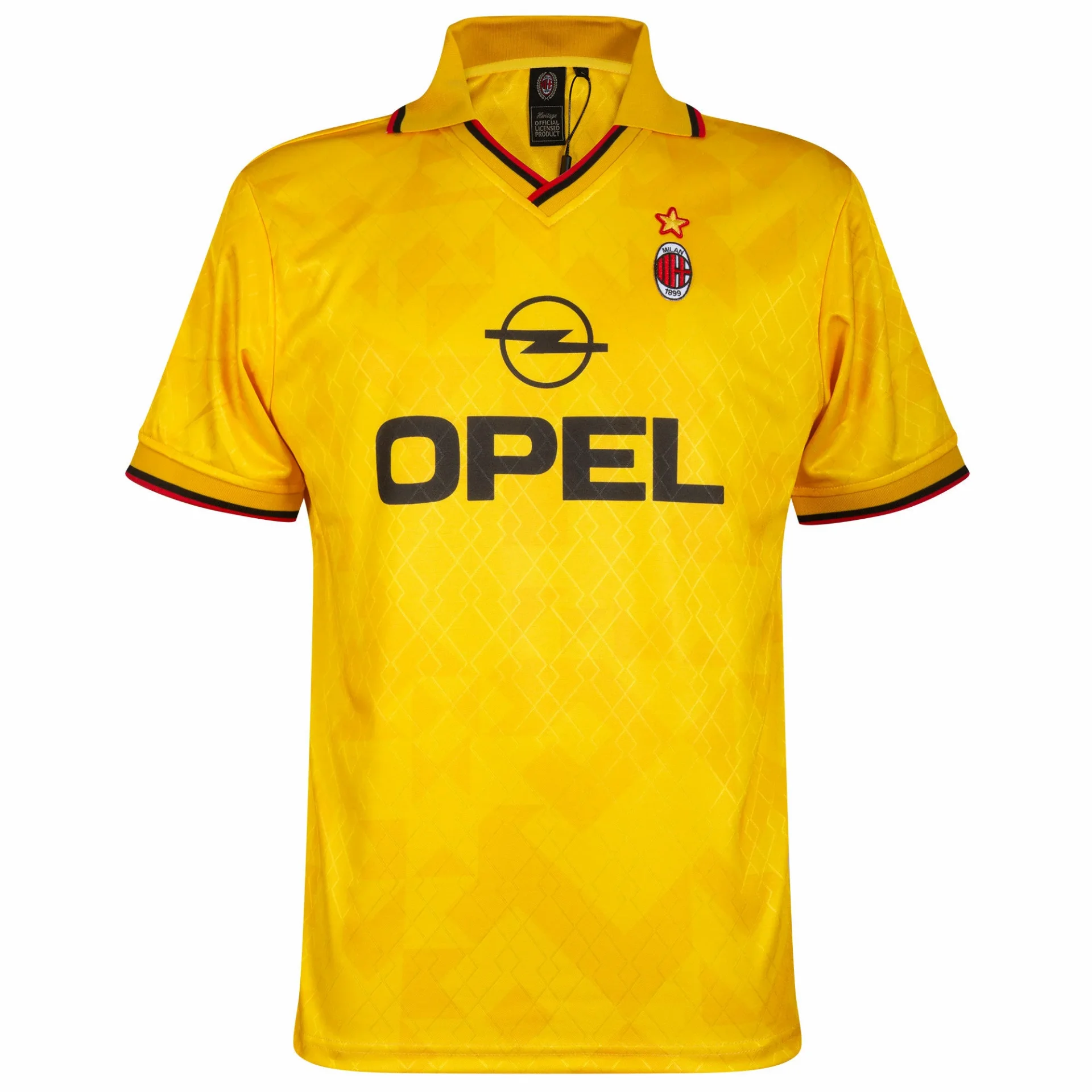 Il s'agit du 3ème maillot de football rétro officiel de l'AC Milan 1995-1996. Ce maillot de football rétro de Milan est basé sur le troisième maillot de football de l'AC Milan de la saison 1995/96. Le maillot de football rétro est majoritairement jaune. Au milieu se trouve le nom du sponsor OPEL de l'époque. La poitrine gauche contient le logo de l'AC Milan avec une étoile dorée au-dessus. De plus, ce maillot de football rétro de l'AC Milan possède un col en V et un col polo avec une ligne rouge et noire. Le passepoil contient également ces couleurs. Joli maillot de football de l'AC Milan pour le vrai fan de Milan ! Le maillot de football rétro de l'AC Milan de COPA Football a une coupe normale. Matériau : 100 % polyester recyclé.