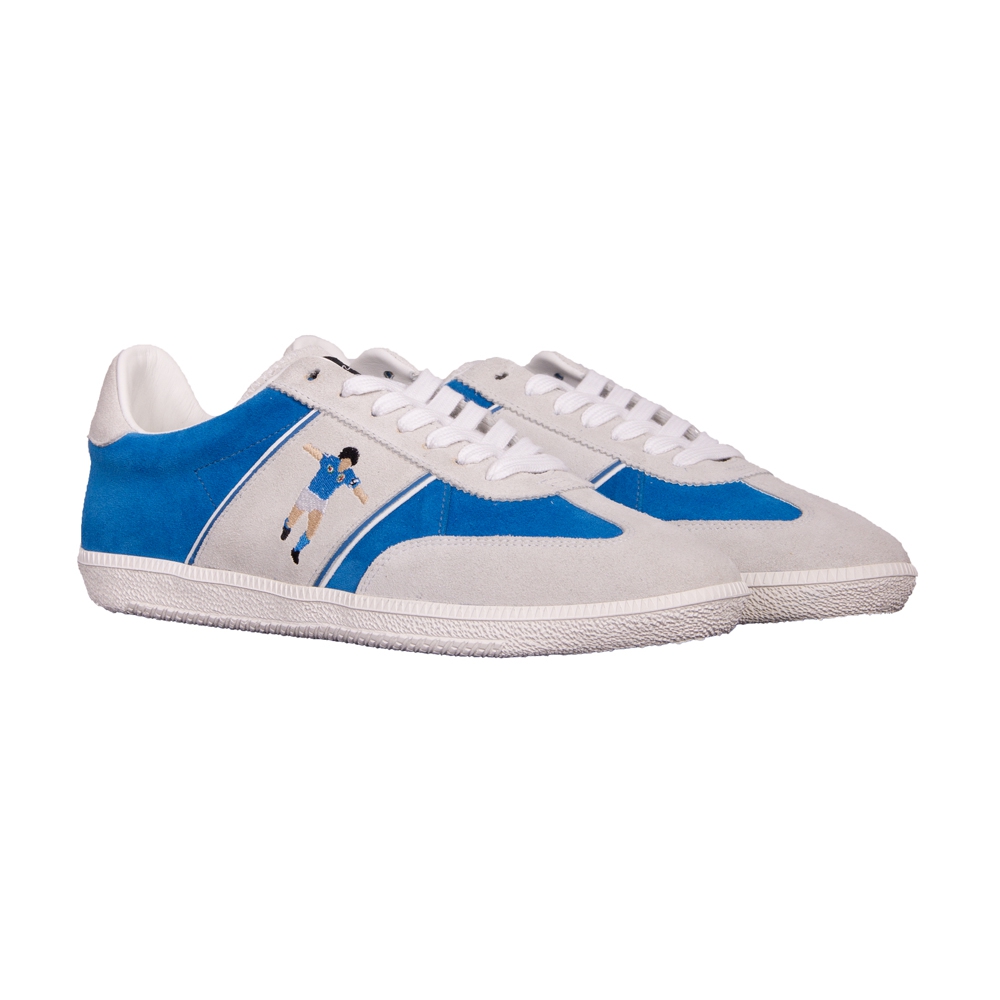 Maradona Napoli-Sneaker für Erwachsene von COPA Football. Die Sneaker stammen aus der offiziellen Maradona x COPA Football-Kollektion. Die Maradona-Sneaker sind in den Farben von Napoli gehalten und sind blau und weiß. An den Seiten der COPA-Schuhe wurde eine Stickerei eines jubelnden Diego Maradona im SSC Neapel-Outfit angebracht. Der Argentinier wurde mit Napoli zweimal italienischer Meister und gewann zudem den UEFA-Pokal. Auf der Zunge des sportlichen Sneakers ist das Diego Maradona x COPA Football-Label angebracht. Mit diesen limitierten Sneakern würdigt COPA Football das Erbe Maradonas. Auf der Ferse ist der Name der Marke COPA zu sehen. Der Sneaker besteht zu 100 % aus Nubukleder und steht auf einer strapazierfähigen Gummisohle. Der Schuh hat eine normale Passform.