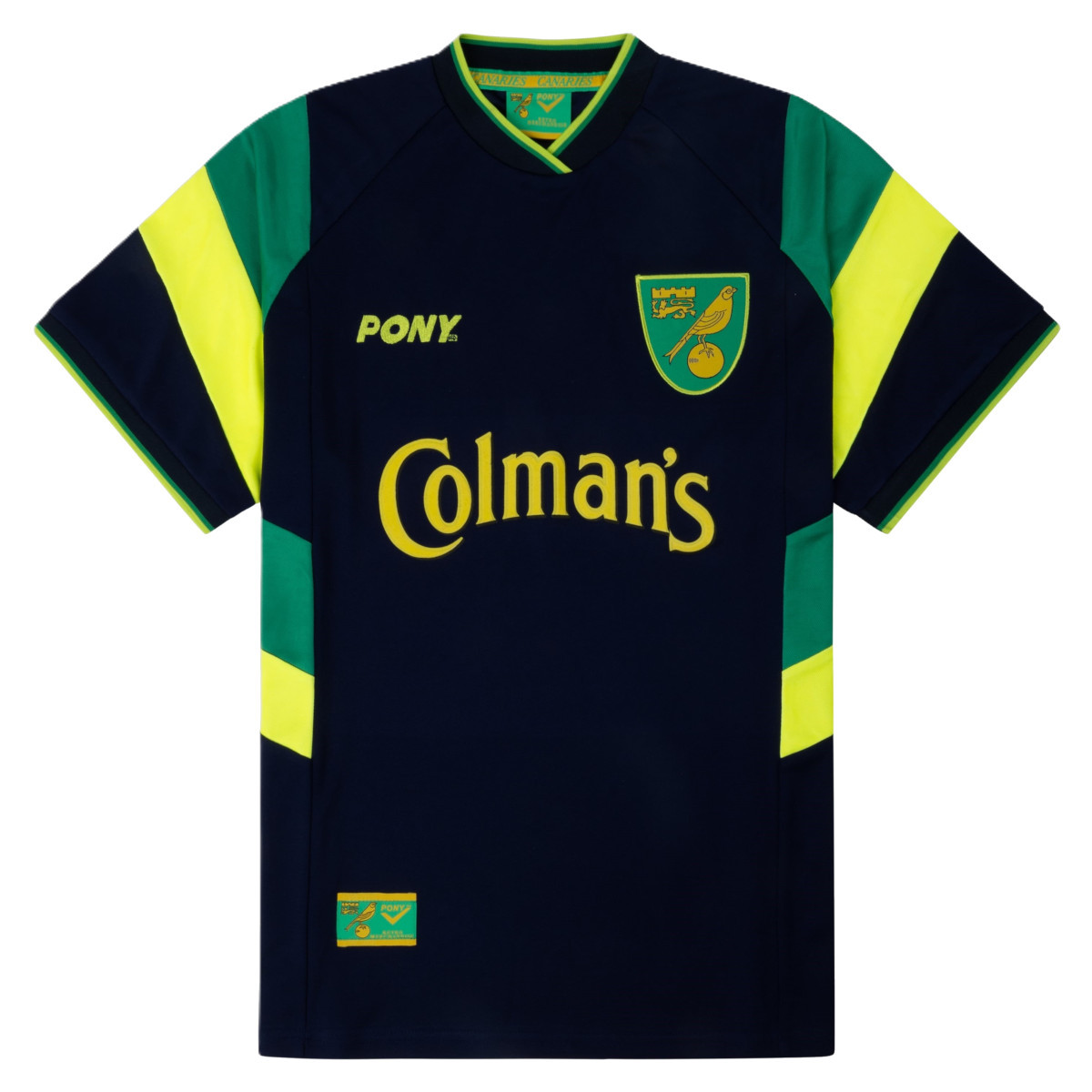 Dies ist das offizielle Pony Norwich City Retro-Fußballtrikot 1997–1999 für Erwachsene. Dieses Retro-Fußballtrikot von Norwich City basiert auf den Ausweichtrikots, die von 1997 bis 1999 getragen wurden. Das dunkelblaue Retro-Fußballtrikot von Norwich hat kurze Ärmel und enthält gelbe und grüne Details. Der V-Ausschnitt ist mit einem dünnen grünen und gelben Streifen versehen und auch die Paspelierung enthält diese Farben. Die Farben Grün und Gelb kommen auch im Schulterbereich und an den Seiten des Trikots vor. In der Mitte der Brust ist der Name des damaligen Sponsors Colman’s aufgedruckt. Auf der linken Brust befindet sich das Logo von Norwich City FC und auf der rechten der Name des Bekleidungssponsors Pony. Dieses Fußballtrikot von Norwich City wurde in den Saisons zwischen 1997 und 1999 von Spielern wie Craig Bellamy, Erik Fuglestad, Victor Segura, Danny Mills und vielen anderen getragen. Material: 100 % Polyester.