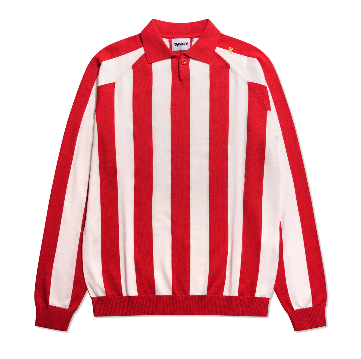 Gestricktes Retro-Fußballshirt von Robey Sportswear für Erwachsene. Das gestrickte Fußballshirt ist rot-weiß gestreift und von den Fußballtrikots von Sparta Rotterdam inspiriert. Das Robey Knit Shirt zeichnet sich durch seine roten und weißen Streifen aus. Zusätzlich verfügt das Shirt über einen roten Polokragen und einen geknöpften Halsausschnitt. Auf der linken Schulter befindet sich ein goldenes vierblättriges Kleeblatt. Fällt normal aus. Wir empfehlen, die gewohnte Größe zu bestellen. Dieses Retro-Shirt besteht aus 100 % weicher Baumwolle.